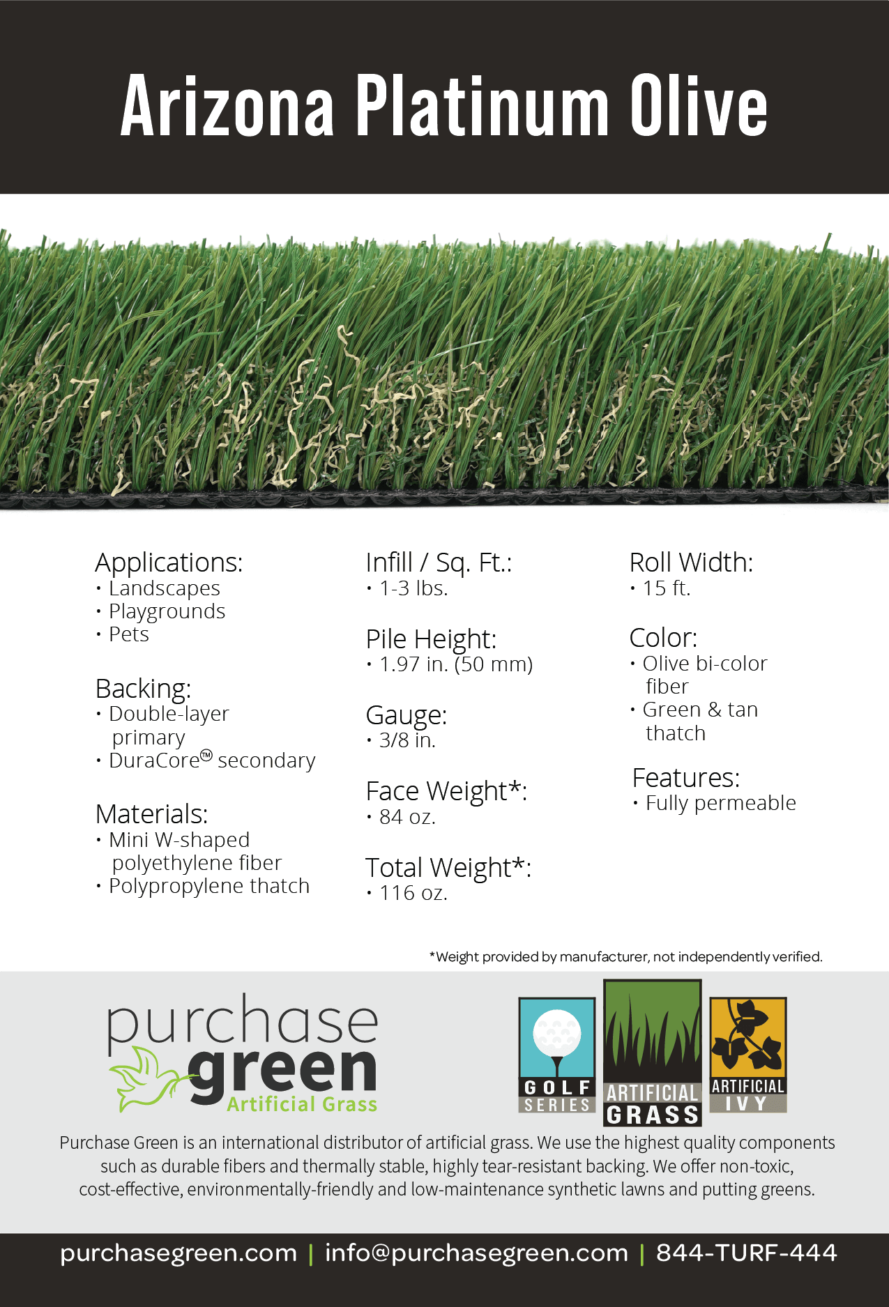 Arizona Platinum – Olive is a rich synthetic turf that mimics the look of well-watered, lush landscapes. It’s two-inch tall pile height and slim bi-colored blades create visually-appealing landscapes that appear healthy and flourishing. Suitable for kids and pets, Arizona Platinum – Spring is a great option for residential installations, communal areas, and playgrounds. And, with the use of Purchase Green’s Cool Yarn technology, this grass keeps 10-20% cooler than similar non-treated artificial grasses.