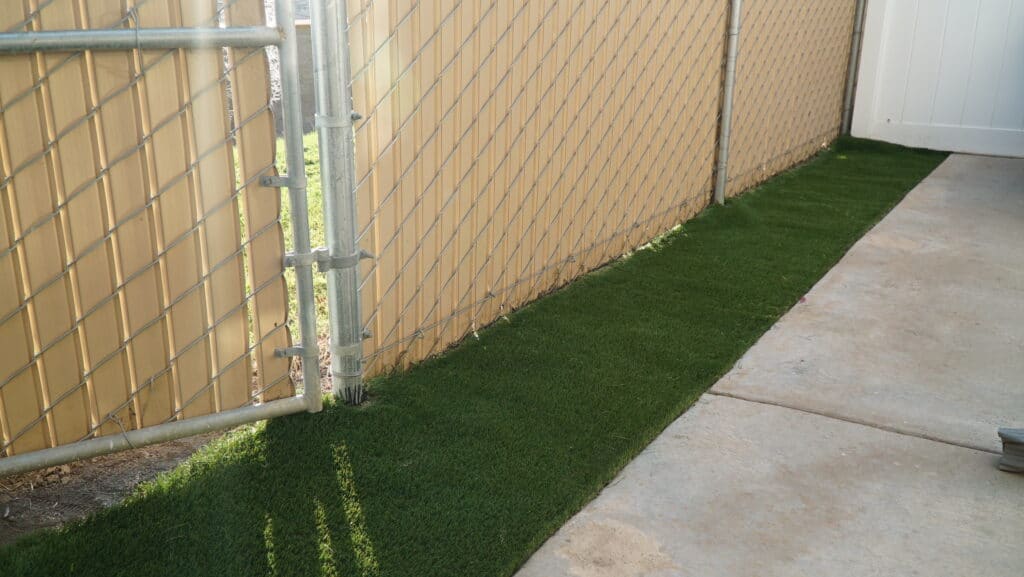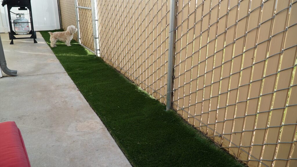 I ended up finding two Arizona Pro remnants that would fit great in the space and would work for their dog, Peaches. Arizona Pro is a Cool Yarn grass so it’ll reflect more heat from the sun, and it can withstand high traffic – perfect for Peaches! After picking our remnants, we moved onto tools and accessories – what we were going to need to actually install. Since our installation was only 50 sq.ft., we only needed one 10lb box of 5″ nails and the smallest roll of weed barrier. We decided that since our one seam was only going to be 2 feet long, we would just use nails instead of seaming tape and glue. Again, not as robust, but more cost and labor-effective. For our infill, we decided on HeroFill since it’s the best option for areas with pets. Regular silica infill stinks when pets use the area, but Herofill controls odors caused by pets, mildew, and mold – it’s also antimicrobial. We got two 50lb bags of infill, but we only ended up using one. We got a turf broom to brush up the fibers and get the infill down toward the backing. We also got a carpet knife to cut the remnants and 8″ shears to cut the weed barrier. And finally, we bought some Turf Bomb for added odor prevention and treatment down the road.