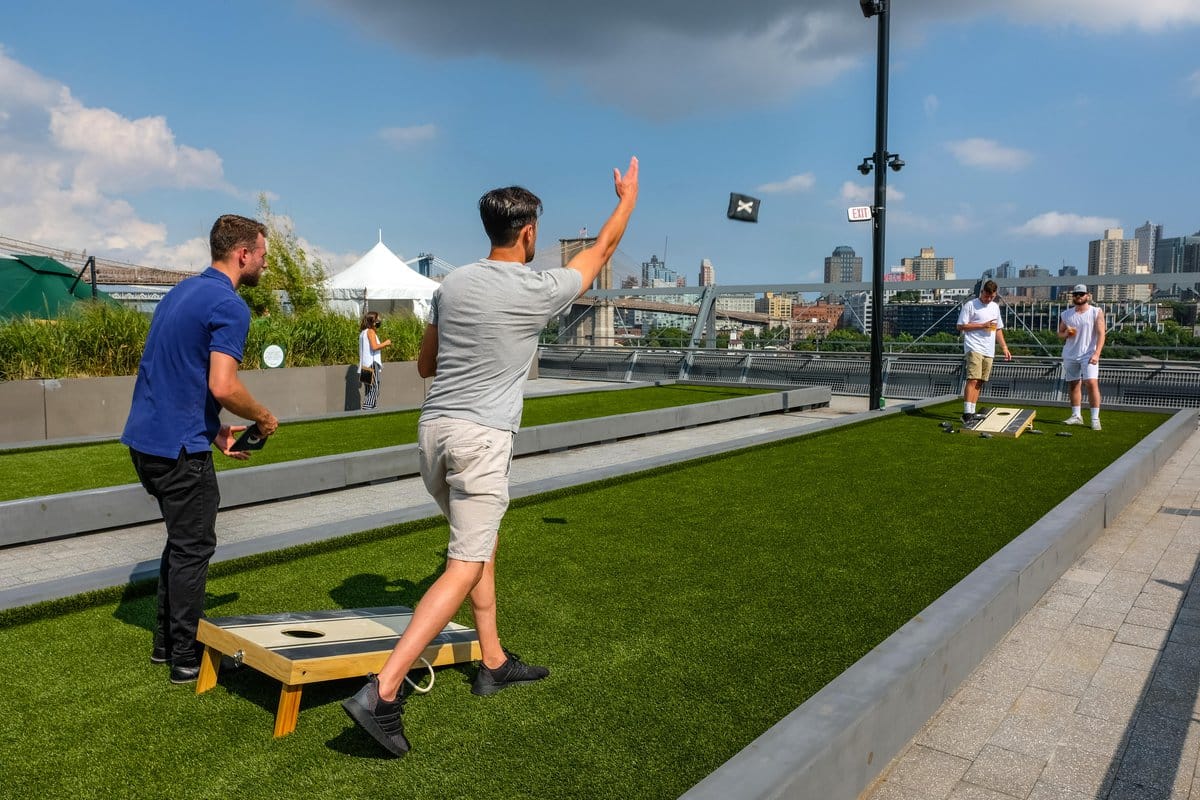 To accommodate guests and provide a fun, safe outdoor space, The Rooftop became The Greens and installed 28 artificial grass mini lawns, each 14’x14′, and four gaming lawns for guests to play bocce ball, corn hole, and giant Jenga.