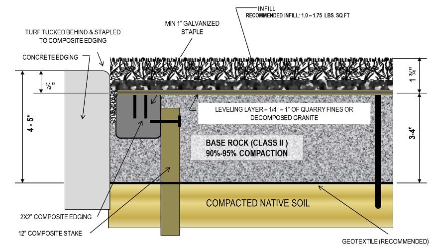 - Now it’s time to install your grass. If your installation requires seaming, be sure to use seam tape and glue to attach the two pieces. Secure the seam into place with 5 inch, non-galvanized nails every 6 inches on both sides (staggered by 3 inches on either side) of the seam. Secure the turf by using 5 inch, non-galvanized nails every 3-6 inches around the perimeter, about 1/2 inch away from the hard concrete edge, as well as every 3 square feet within the interior.
