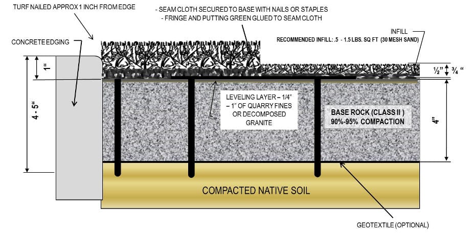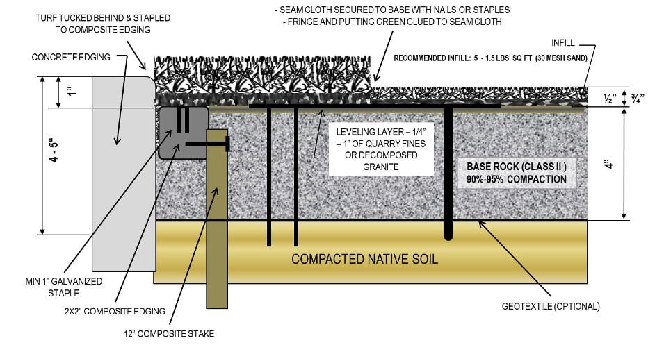 - Along the seam between the fringe and the putting green, attach seam tape to the sub-base with 5 inch, non-galvanized nails every foot.
