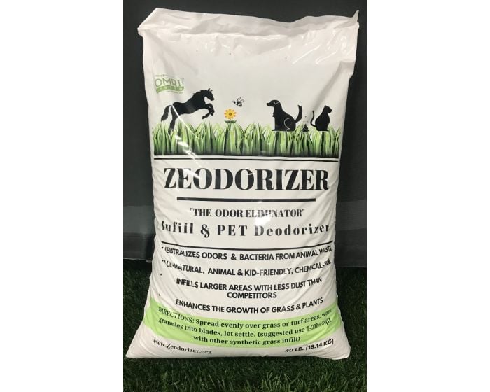 Zeolite is used as an infill for pet applications, primarily for its odor reducing capabilities.Zeolite is a negatively charged, honeycomb-shaped molecular structure which absorbs liquids and gases like a magnet to prevent ammonia from forming a gas. (The ammonia buildup in pet urine is what you typically associate with the smell.) This molecular structure holds the ammonia until the sodium ions found in rain water release the magnetic ability which forces the odor causing bacteria down into the ground ultimately “flushing out” the ammonia smell. The purity rate is the key component in the ability of the Zeolite infill to perform its intended function as an artificial grass infill.A maintenance item to pay attention to when using a Zeolite infill is that it is best NOT to flush your turf from a garden hose when using zeolite for urine odor control because the hose water is usually filtered and will end up being encapsulated in the Zeolite granule in lieu of the urine.This option is also popular with pet owners, but requires additional antiseptic treatment from time to time to keep it free of microbes. Zeolite runs $15 per 50-pound bag.