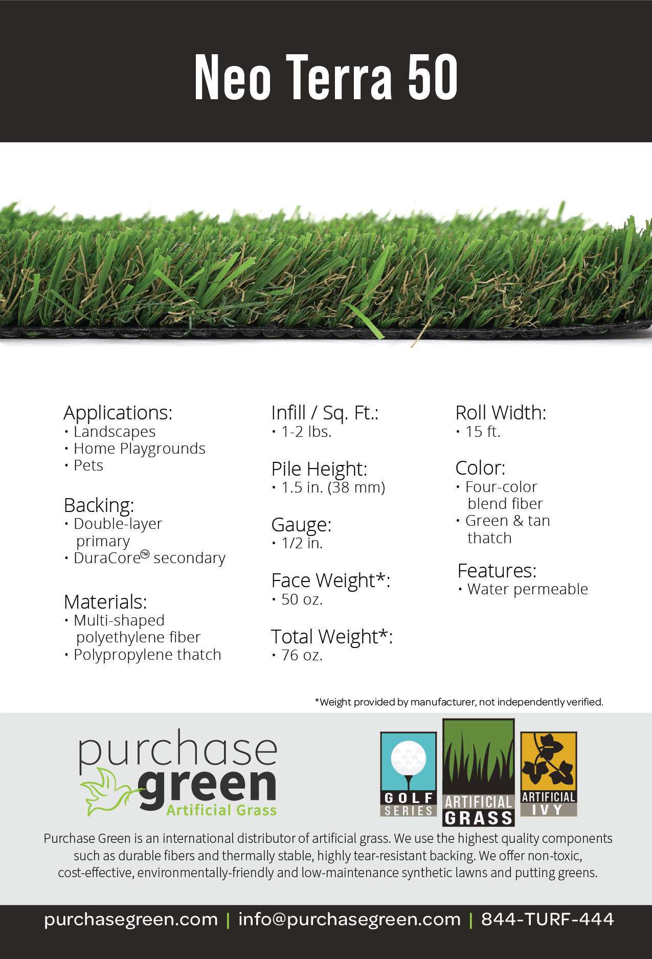 Purchase Green’s Neo Terra 50 uses the latest in yarn extrusion technology. It is a durable, 4 color artificial grass. The color blend causes the grass to appear as a freshly mowed lawn, delivering the most realistic styles we’ve seen on the market in recent years. Moreover, Neo Terra 50 has THREE different blade shapes: S, M, and Diamond. The result is a highly-realistic and extremely durable synthetic turf that is cost-competitive.