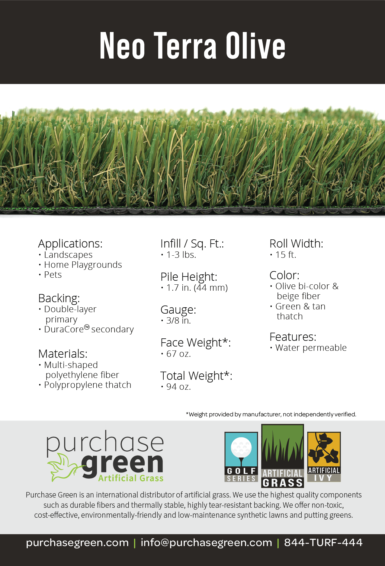 Purchase Green’s Neo Terra Olive uses the latest in yarn extrusion technology designed to be one of the best artificial grasses for lawns available. It is a durable, olive and beige NT artificial grass lawn. The color blend causes the grass to appear as a freshly mowed lawn. Our Neo Terra Olive synthetic lawn grass line is made with a premium-grade blend of S, M, and diamond-shaped fibers.