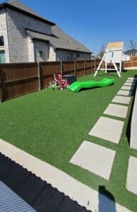 Getting artificial grass for backyard playgrounds is a no-brainer. This one is going to be a safer, more comfortable surface for kids playing and running around. And you’re not trading beauty for safety. Throw in some pavers, and you’ve got a backyard both the kids and the adults can enjoy.