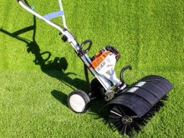 After installing your artificial grass, Purchase Green recommends using a Power Broom. The Power Broom is really easy to use. If you can operate a vacuum, you can operate a Power Broom. The Power Broom features stiff plastic bristles that spin on a rotating drum. This spinning action helps each individual blade of grass stand up tall and straight. It also helps evenly distribute your infill so you new lawn will look and perform its best.