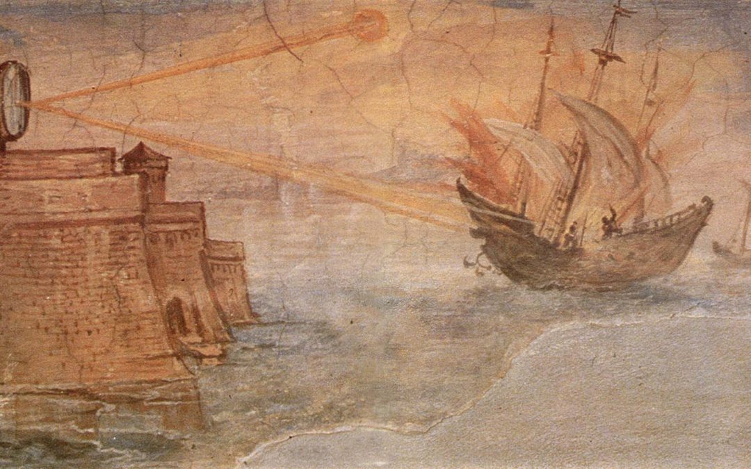 In 212 B.C. legend has it that Archimedes created a terrifying “death ray” that laid waste to invading Roman ships. The ray was thought to have been produced by essentially scaling up the magnifying glass effect and redirecting concentrated sunlight at the enemy, setting fire to their vessels.