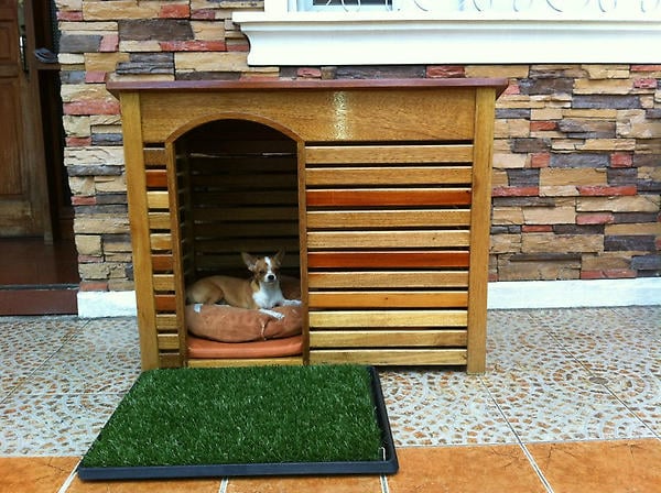 Your furry friends enjoy artificial grass too, even in a small backyard or patio! Use a grass like Spring Fescue Pet Pro to create a little “lawn” or interior for your dog house!