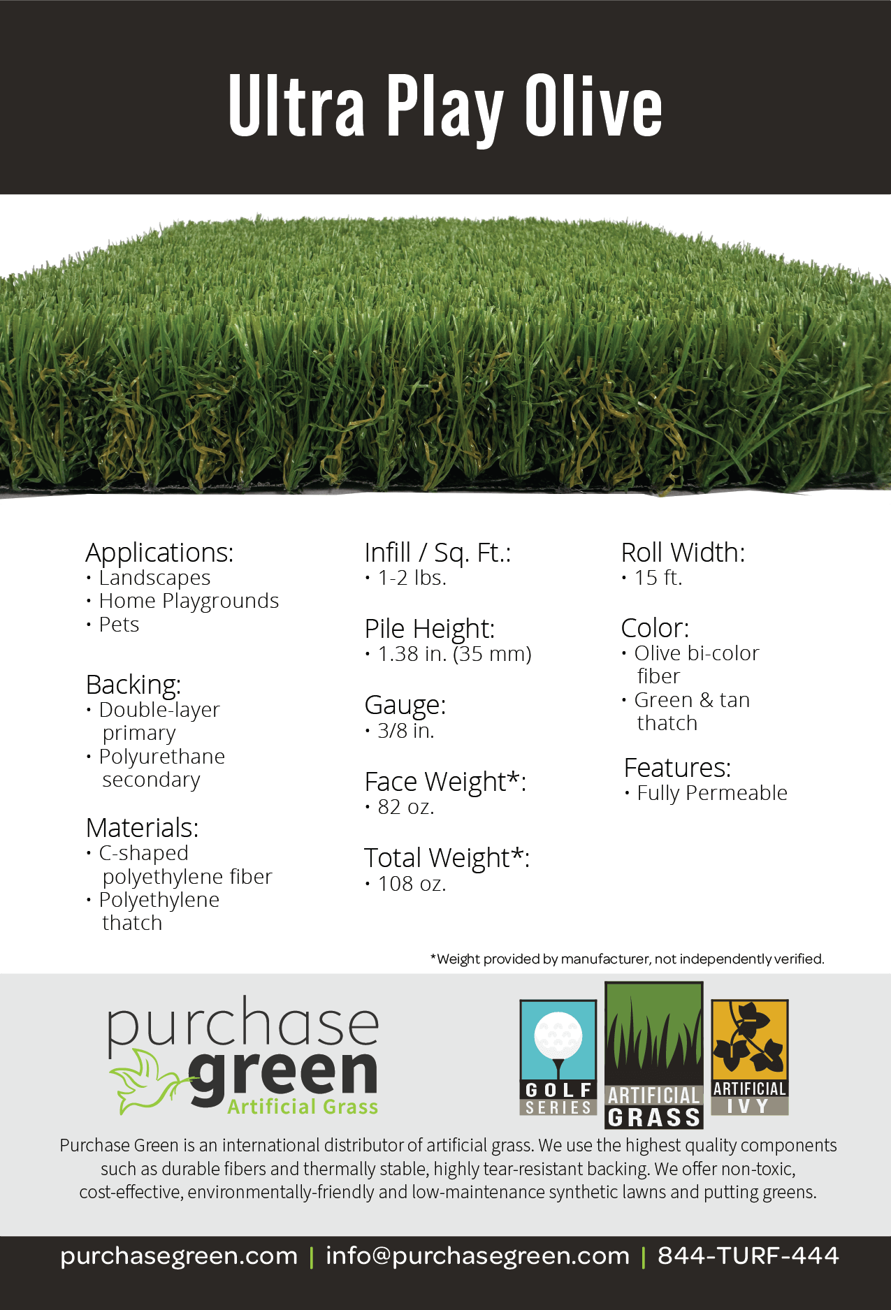 Ultra Play Olive is a spectacular product for customers seeking to add a natural-looking and low-maintenance landscape to their outdoor or indoor spaces. It features a C-shaped, olive green bicolor fiber, and a green and tan added thatch. Furthermore, the beautifully constructed thatch allows for a higher density and ability to withstand matting even with less infill compared to other artificial grasses. The grass is made from a durable, fade-resistant synthetic material that is soft and designed to stay upright.